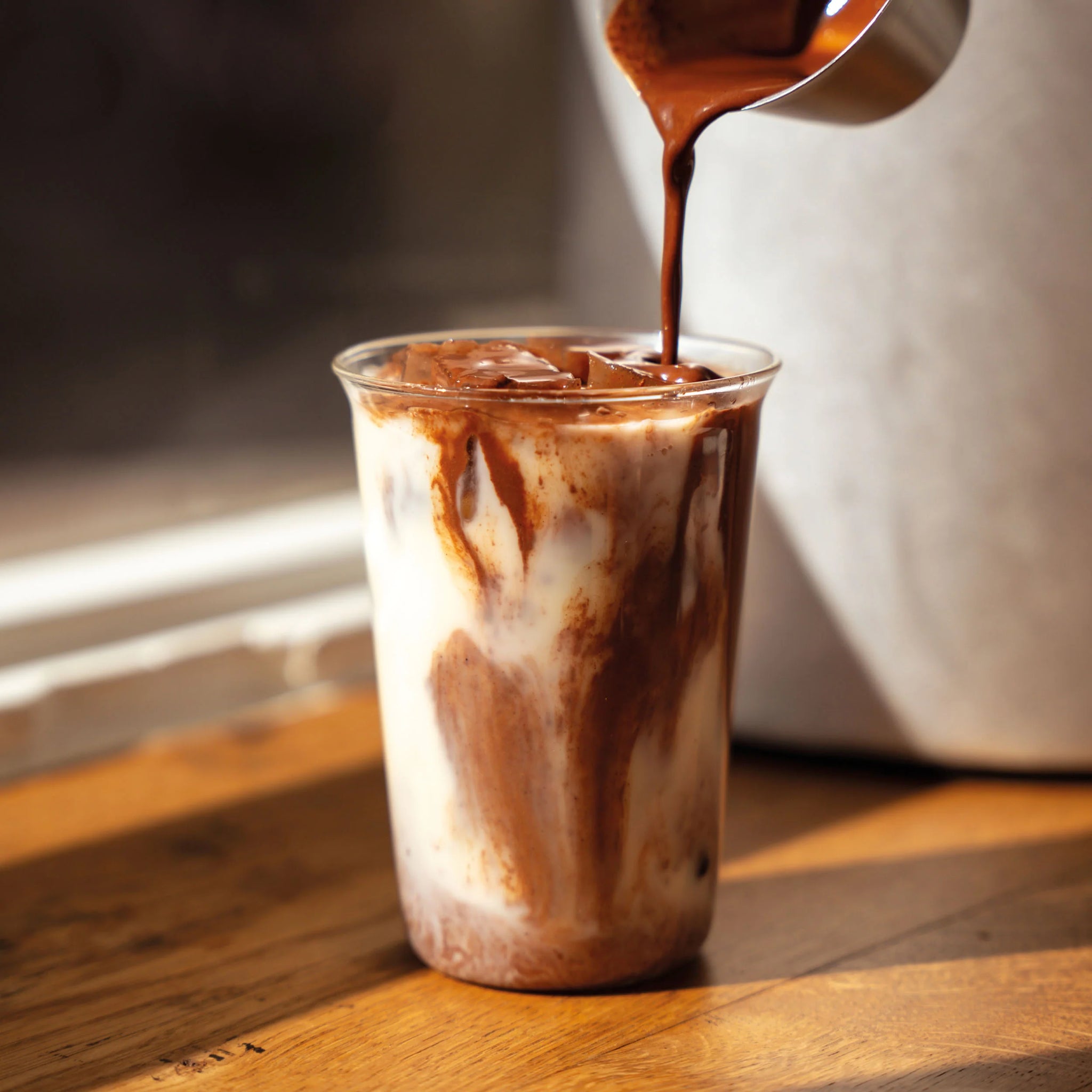 - Vierte la mezcla de cacao lentamente sobre un vaso con hielo y 150-200 ml de leche fría.