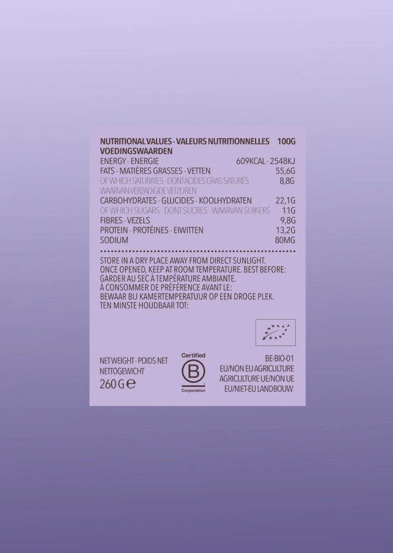 ¿Ves puntos blancos al abrir el frasco? ¡No te preocupes! Esta mantequilla de frutos secos natural contiene auténtico chocolate negro puro, lo que significa que su contenido en manteca de cacao es alto. Debido a la ausencia de aditivos y a la temperatura de almacenamiento del producto, es posible que los sólidos de cacao se separen del resto y aparezcan como puntos blancos en la superficie. Este proceso natural se denomina efloración del chocolate. Cuando esto ocurra, simplemente vuelve a mezclar bien. Aunque tenga un aspecto desagradable, esto no significa que el producto sea inapropiado para el consumo y también puede ocurrir con otras cremas de chocolate.